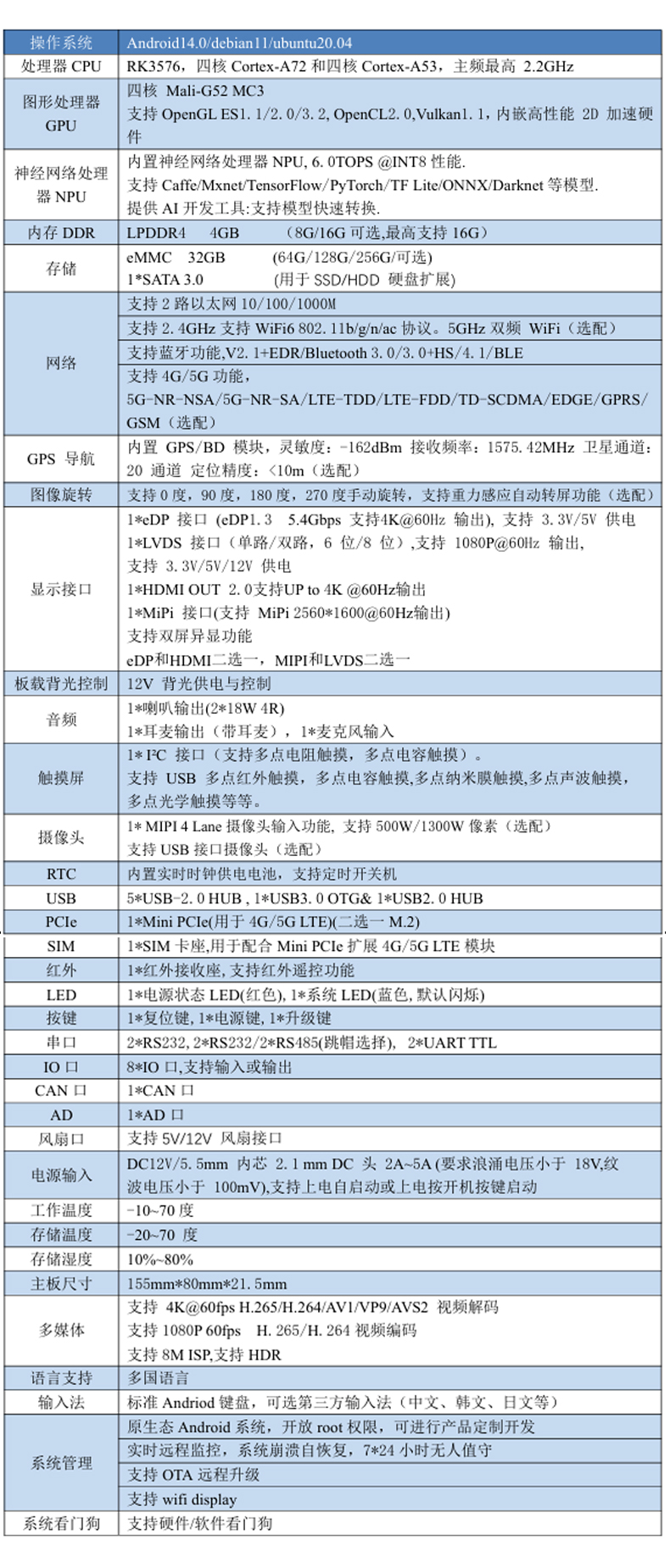 處理器CPU RK3576,四核Cortex-A72和四核Cortex-A53,主頻最高2.2GHz