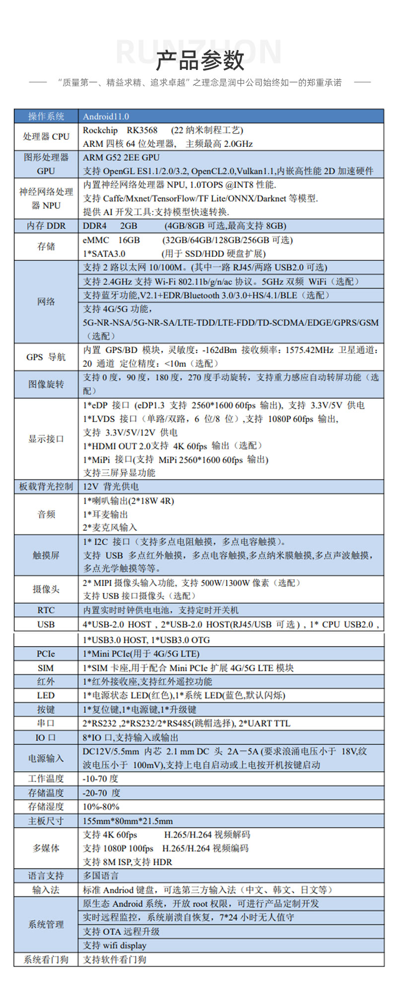 0T-2168K 高性能智能主板,采用瑞芯微 RK3568 高性能 AI 處理器、神經(jīng)網(wǎng)絡(luò)處理器 NPU, Android 11.0 操作系統(tǒng), RK3568 是基于四核 A55 采用全新 22nm 工藝的 ARM v8.2-A 架構(gòu)四 核 64 位 CPU,主頻高達(dá) 2.0GHz,擁有超強(qiáng)的通用計(jì)算性能,GPU 采用 ARM G52 2EE,CPU 內(nèi)部 集成 AI 神經(jīng)網(wǎng)絡(luò)處理器 NPU,運(yùn)算性能高達(dá) 1.0TOPS,支持多種 AI 開(kāi)發(fā)工具和接口。支持三 屏異顯功能,支持 LVDS 接口 1080P 輸出,eDP 和 MiPi 顯示接口輸出,HDMI-4K 輸出, 支持雙百兆以太網(wǎng), WiFi, USB 擴(kuò)展/重力感應(yīng)/ CAN/RS232/RS485/IO 擴(kuò)展/補(bǔ)光燈/I2C 擴(kuò)展 /MIPI 攝像頭/紅外遙控器等功能,豐富的接口,一個(gè)全新四核擁有超強(qiáng)性能的人工智能芯片 讓產(chǎn)品變得更加完美,被廣泛的應(yīng)用到 AI 服務(wù)器、人臉支付設(shè)備、安防、醫(yī)療、交通、金 融、工控、智慧教育、智能零售等等 AI 智能領(lǐng)域。由于其硬件平臺(tái)化、Android 智能化的 特點(diǎn),在需要進(jìn)行人機(jī)交互,網(wǎng)絡(luò)設(shè)備交互時(shí),都可以在智能終端主板上進(jìn)行使用。